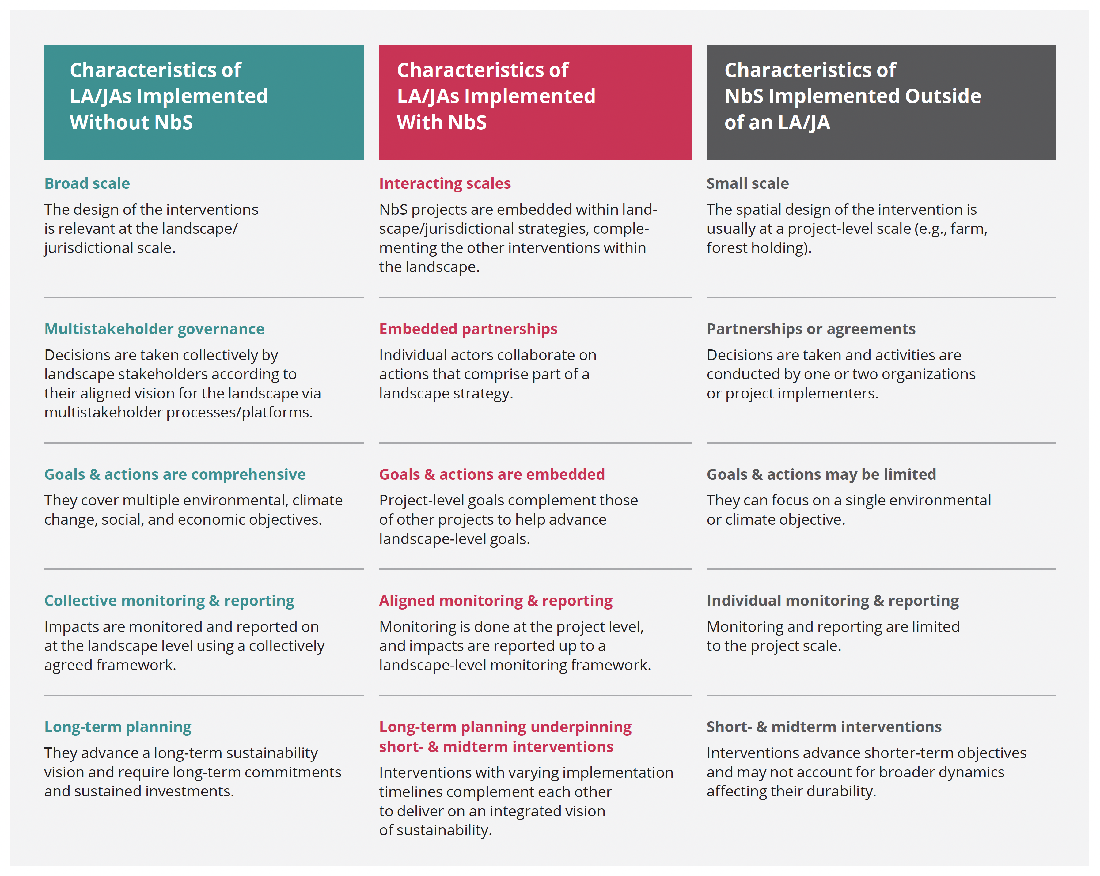 • Integration within a LA/JA is a core component of high-quality NbS. When embedded within a landscape strategy, NbS help deliver impact at meaningful scales, and a LA/JA’s multi-stakeholder governance and alignment with government policy ensuring durable NbS impacts.